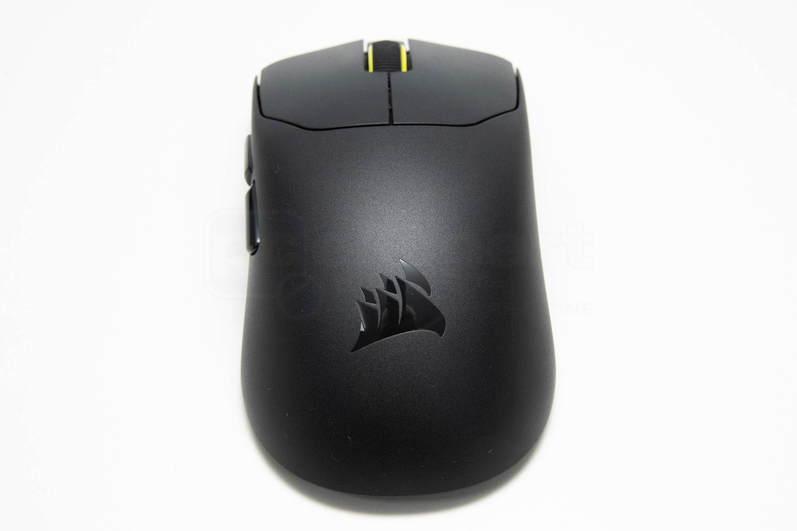 Na prednjoj se nakošenoj strani nalaze dva poklopca prekidača (tipke) koje su dovoljno široke za prste, te imaju blago izravnane površine kako prsti ne bi bježali s njih – nisu udubljene, no nisu ni zaobljene kao ostatak miša. Pritisak na prekidač proizvodi ponešto jeftin zvuk pojačan šupljinom miša, no nije naročito neugodan. Corsair ne navodi koje prekidače koristi, navode samo da su mehanički i s životnim vijekom od 100 milijuna prekidanja. Scroll kotačić je crn u sredini i žut po rubu. Šupalj je i s PCB-a u unutrašnjosti ga obasjava jedna zelena LED-ica. Kotačić ne klizi lagano, pruža otpor, uz pomalo nejasne prijelaze između pojedinih koraka.